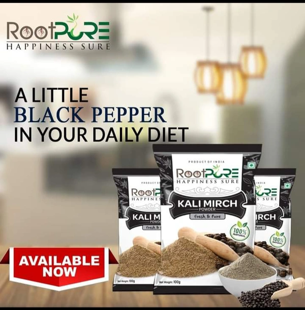 Rootpure Kali mirch is a spice made from dried black peppercorns. It has a pungent, spicy, and bitter flavor and aroma. It is used in various cuisines and has health benefits.